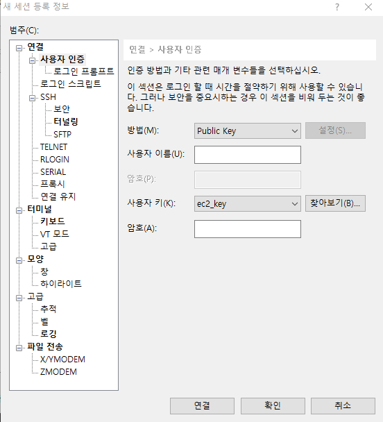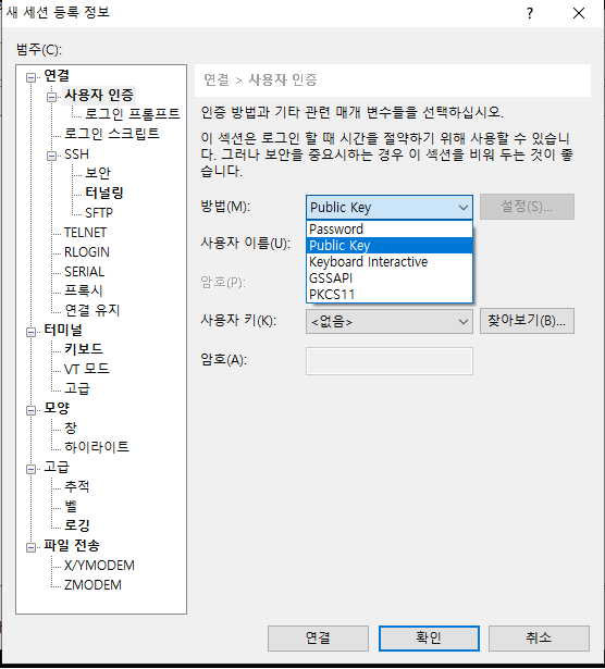 EC2 접속을 위한 키 등록을 위해 '방법' 글자 옆 드롭박스 창을 클릭해서 Publick Key를 선택해 줍니다.