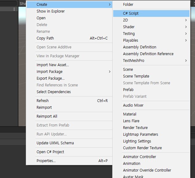 Project 창에서 마우스 우클릭을 하면 아래 사진과 같이 창이 뜨는데 여기서 Create -> C# Script 를 선택해줍니다.