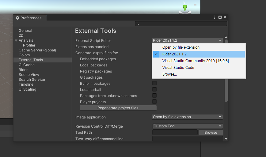 2. Preferences 창에서 External Tools-> External Script Editor 오른쪽 선택창 버튼을 클릭하면 아래 사진과 같이 선택할 수 있는 편집기들이 보이는데 이 중에서 Rider를 선택 후 창을 닫습니다.