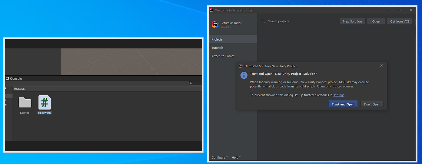 파일을 실행하면 오른쪽 화면처럼 Rider에서 선택창이 뜰텐데 Trust and Open 버튼을 선택해 주시면 Rider 편집기가 실행이 됩니다.