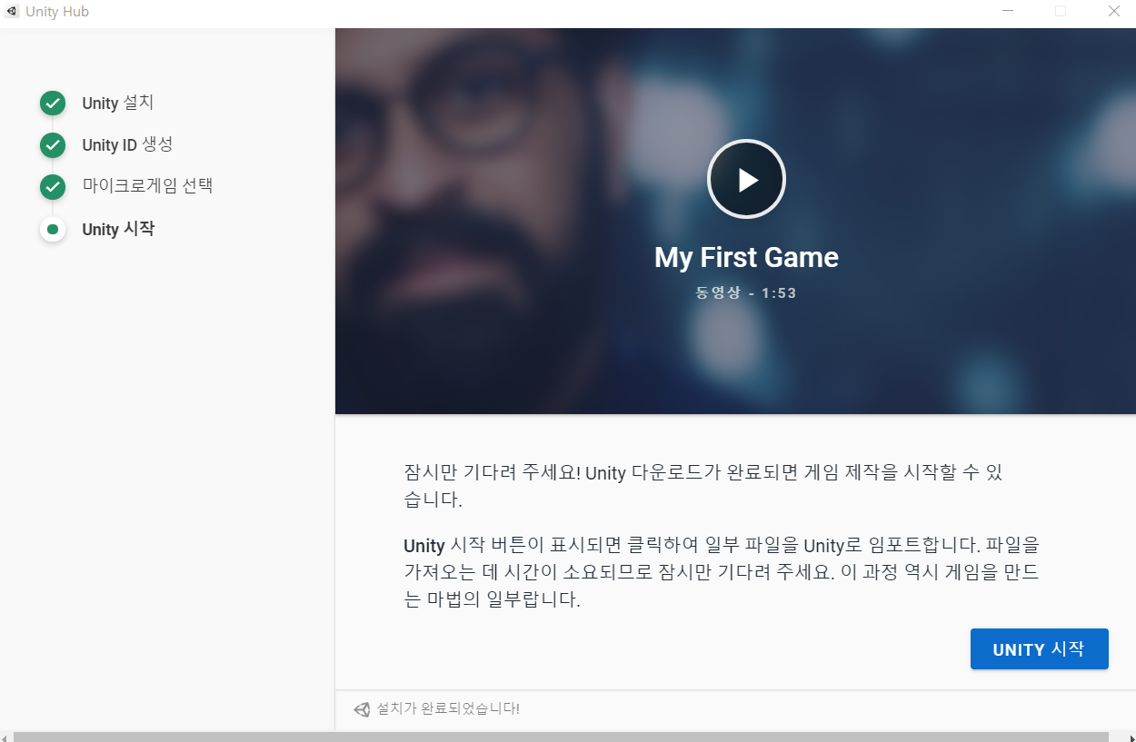 Unity 시작을 누르면 유니티가 실행이 됩니다.