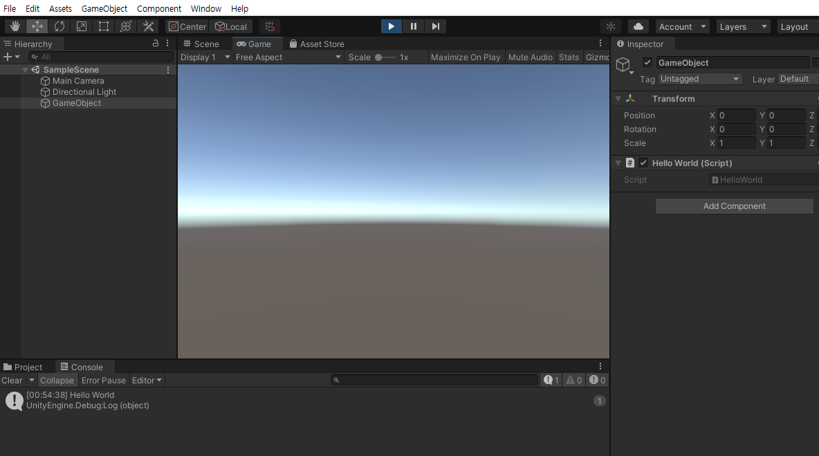 5. 창을 Console 창으로 바꾼 다음 가운데 상단에 있는 Play 버튼을 누르면 아래 사진과 같이 Hello World라는 로그가 출력되는 것을 확인하실 수 있습니다.