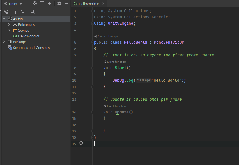 Hello World라는 값을 출력하는 코드를 작성 후 ctrl + s를 누르면 코드가 저장이 되면서 유니티에 반영이 됩니다.