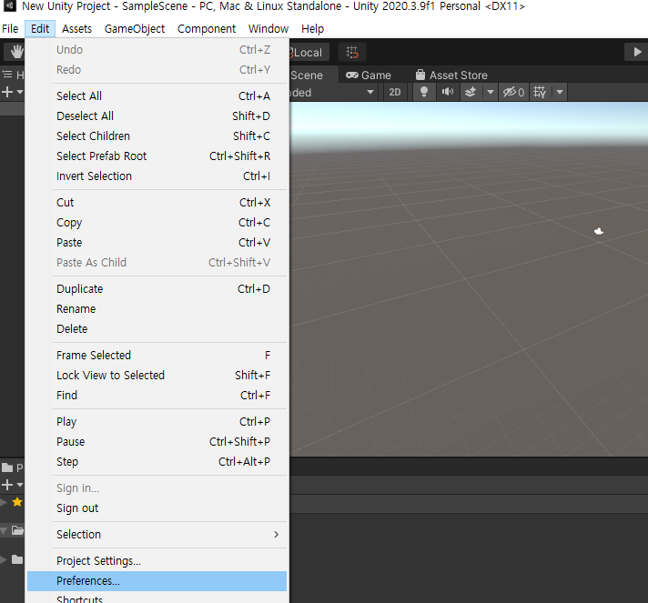 1. 유니티 실행 후 Edit -> Preferences 버튼을 클릭해줍니다.
