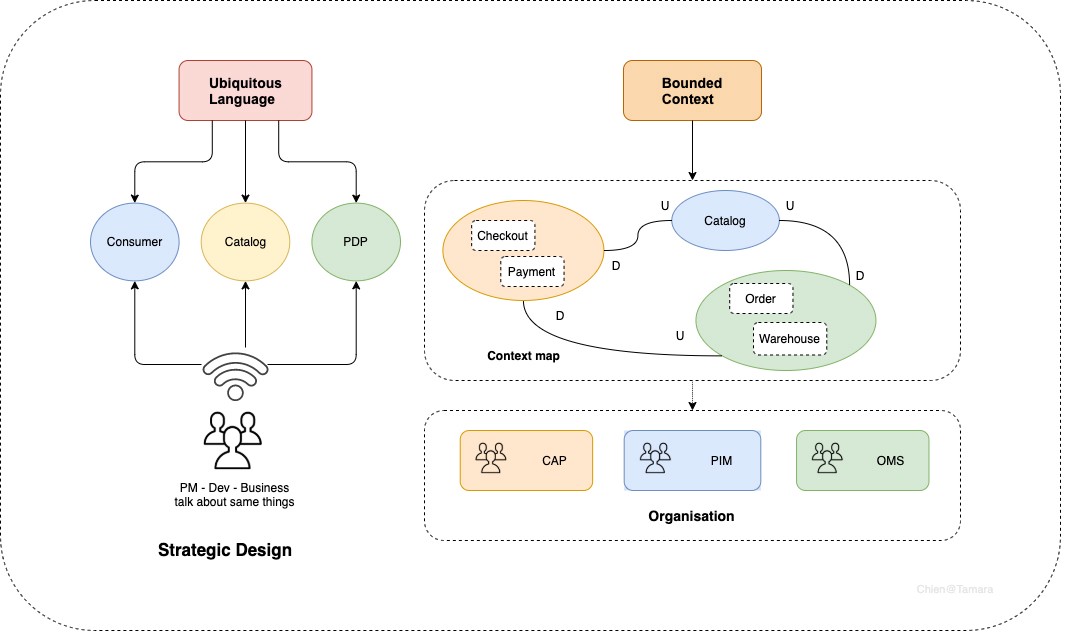 - 도메인 전문가 및 기술팀이 함께 모여 도메인에 대한 지식 공유 및 이해를 한 다음 이를 기반으로 유비쿼터스 언어(Ubiquitous Language)를 정의합니다.