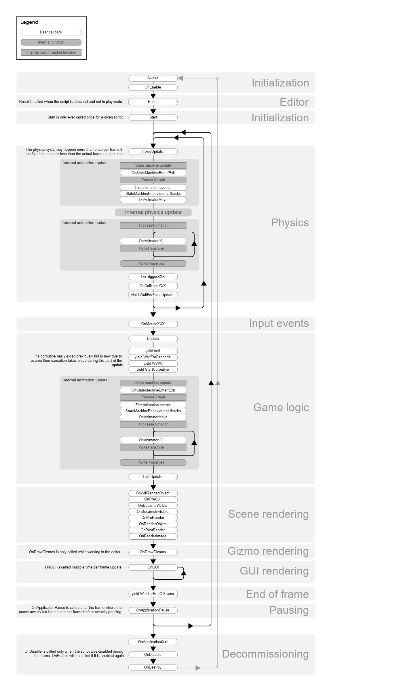 - 프레임 속도가 낮은 경우 프레임당 여러 번 호출될 수 있으며 프레임 속도가 높은 경우 프레임 사이에 호출되지 않을 수 있습니다.